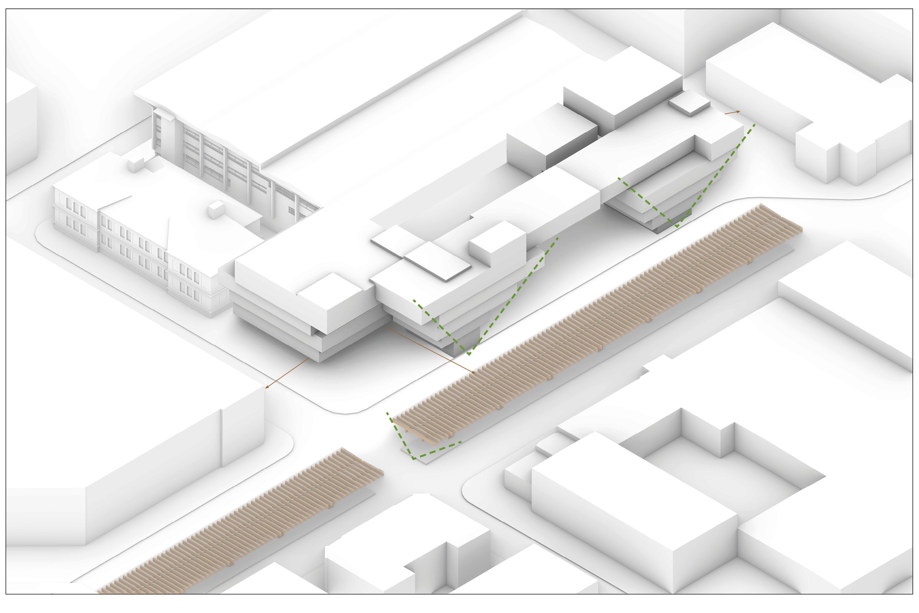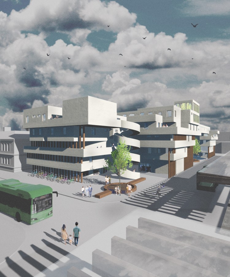 To increase the permeability, maintaining public openness and thus the idea of the city within a block, the ground floor has been given the smallest footprint. Through a cantilevering principle, the footprint increases vertically. This creates a successive stacking of blocks which relates to the stacking principle of the wooden structure as the neighboring bus stop.