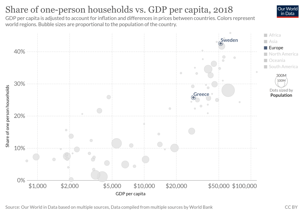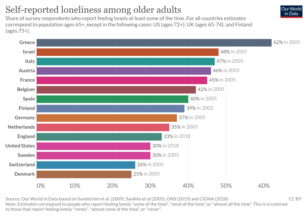 A popular answer seems to be “push more people together”, as if building cities the same way we always have could both be the problem and solution at the same time. People argue that the economic progress of the individualist democracy and welfare safety nets, which enabled people to live alone, goes against tribal history. In the past, people stayed together and helped each other because they had to, and the physical isolation of modern society has made us lonely. They list Sweden as a detrimental example of individualism = loneliness. But, this argument seems to disregard that there’s no proven causal relation, and that countries like Greece, where living alone is less common, has higher levels of self-reported loneliness. Individualism doesn’t disconnect with society, it ensures the freedom to choose your social network and form healthy relationships.