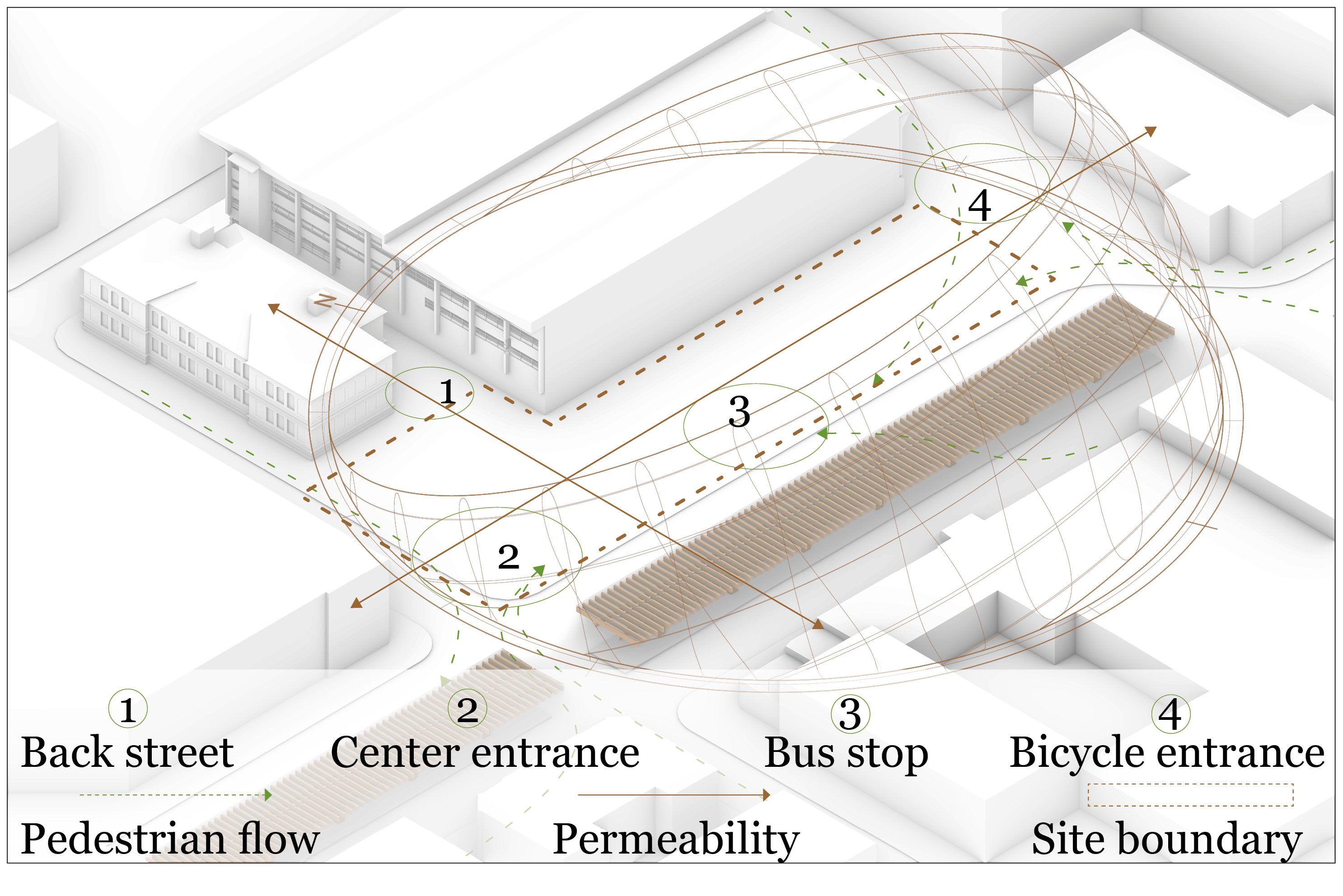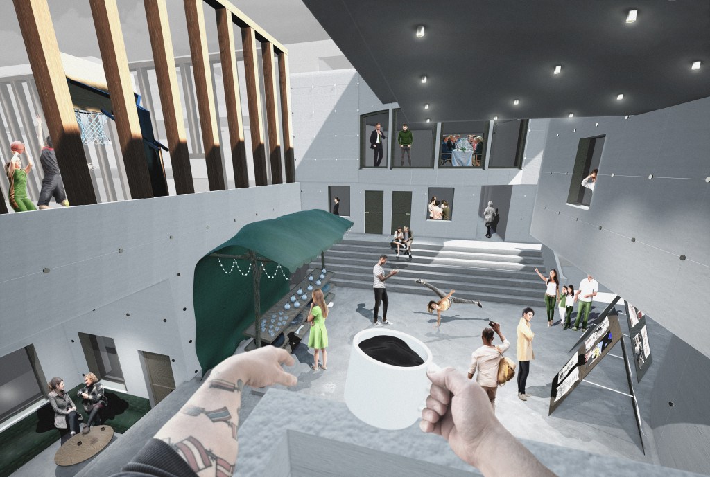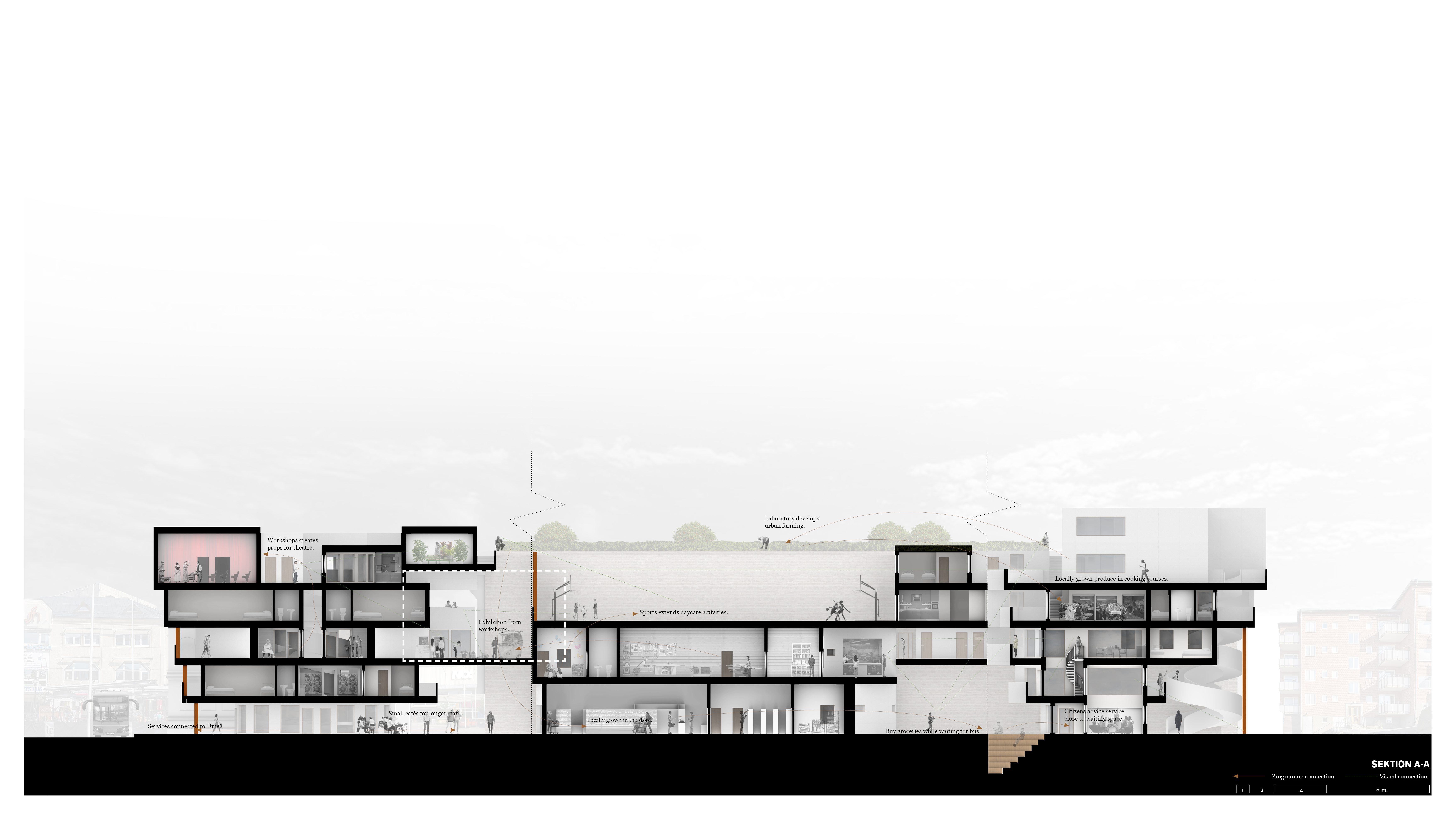 The different programmes have been evaluated based on their needs for privacy versus public availability. Through relational matrices, the programmes were placed in relation to each other for potential synergy effects. Workshops have been placed close to the theatres for the creation of props, laboratories, urban farming, and cooking courses have been placed close to each other to support each other’s activities.