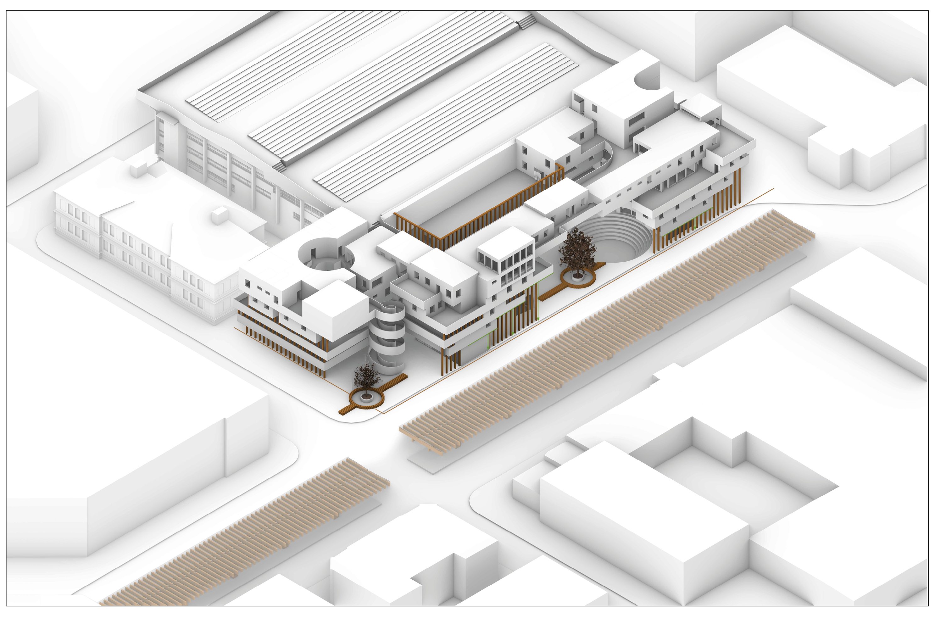 The blocks have been given dynamic disruptive moments and variations through circular and rounded voids and volumes, which help to create areas of circulation and meeting spaces.