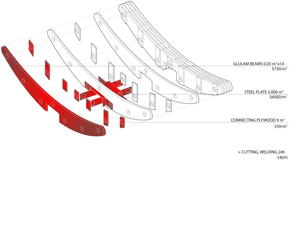 It’s a simple curved plus-shaped structure made from pre-cut profiles joined together with a welded steel plate for balancing counterweight and structure. The profiles are spaced apart using smaller connecting plywood pieces.