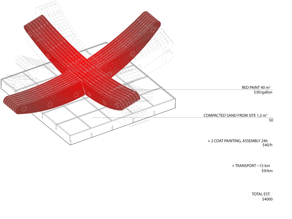 The installation is placed on a platform of submerged base boards filled with sand from the site. This is to ensure that the structure won’t sink into the ground, but remain a playful balancing act.
