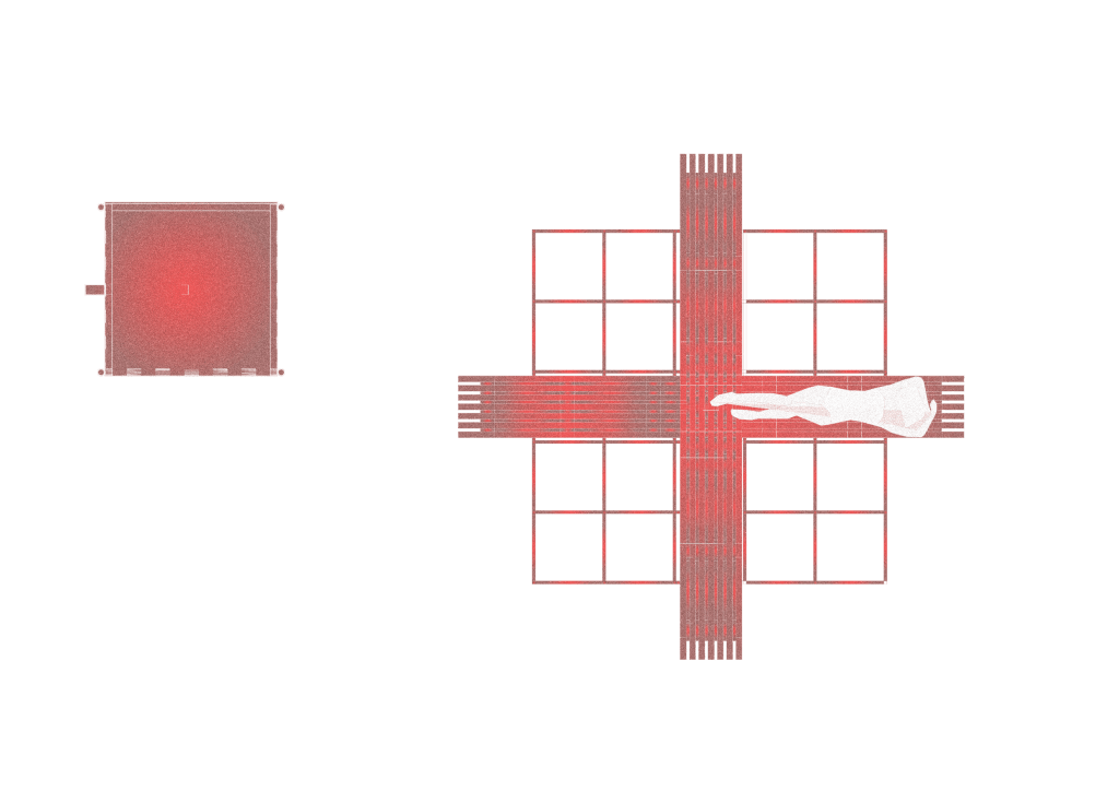 It’s painted with red paint to resemble and celebrate the local lifeguard stations on the beach, for resonance, but also to produce a playful piece of outdoor furniture that stands out from its white, snowy surroundings.