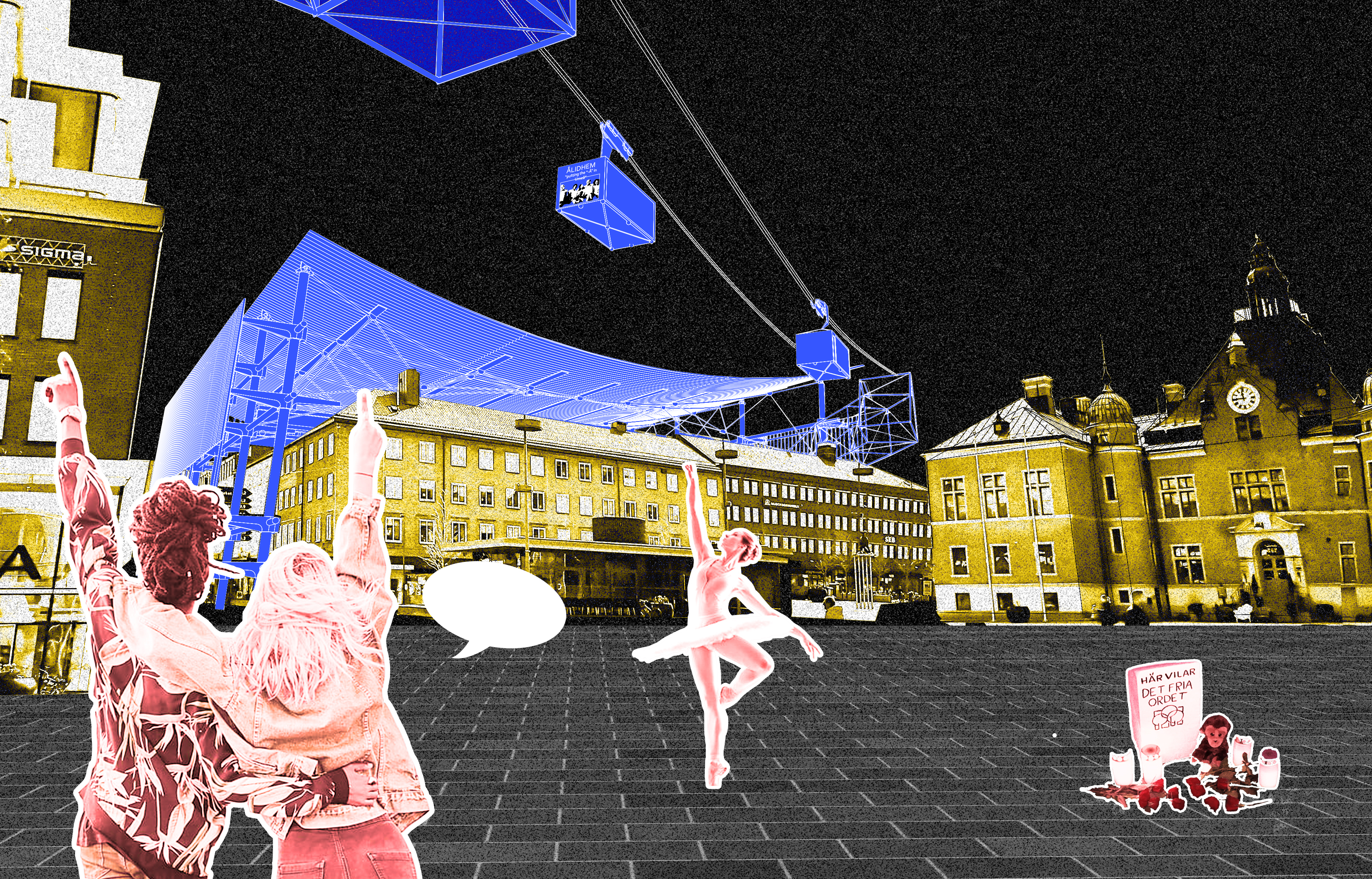Cable cars coming into the Central Hub of the Industrial Ballerina democracy infrastructure. Illustration: Johan Vonkavaara